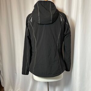 EDDIE BAUER black women's sport hooded full-zip fleece jacket. Size Large. Shell is nylon, spandex, polyester. Measures approximately 22" arm pit to arm pit. Comes from a smoke-free home.