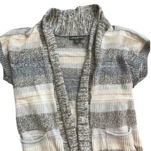 EDDIE BAUER Knit Open Short Sleeve Cardigan. Brown Striped Sweater. 100% Cotton with pockets. Made in the USA. Excellent condition, no flaws.