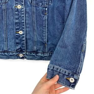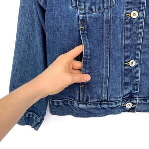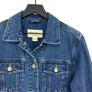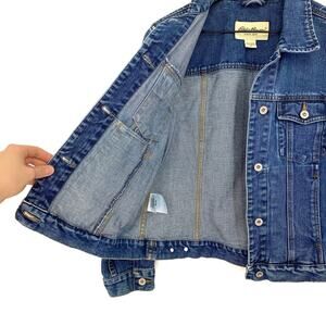 Eddie Bauer Jean Jacket in a medium blue wash denim. Button down the front, collar neck, front pockets, buttons at the cuffs. Not stretchy. Great classic! Great condition!