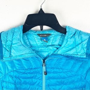 EDDIE BAUER First Ascent Goose Down Filled Long Sleeves Front Zipper Hooded Lightweight Quilted Puffer Jacket, Size Small. Showing minimal signs of wearing with faint marks (please review photos for details). Gently worn pre-owned condition.