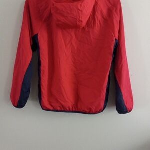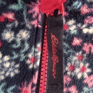 This Eddie Bauer Girl's reversible jacket offers a unique design for versatile wear. The outer shell is made of 100% polyester with a vibrant red, blue, and pink floral pattern. It features a zip closure and accents, including a logo, and a warm hood for colder seasons. This jacket is perfect for causal occasions and is machine washable for easy care. The lining material is also 100% polyester, with insulation made of polyester. This jacket is not vintage and is a size medium for girls.