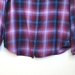 Long sleeve, collarless, plaid, button down shirt made by Eddie Bauer in size Large. 5 navy blue (almost look black) buttons down the front and 2 at each sleeve cuff. 1 extra button is attached to care tag. 2 chest pockets. Colors are various shades of purple, magenta, and blue with a small amount of black. Very comfortable and soft fabric. Shows some signs of wash wear (see "fuzziness" in picture 5). In GUC condition with no holes, snags, or stains. Bundle with other items from my closet for the best deal!