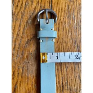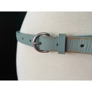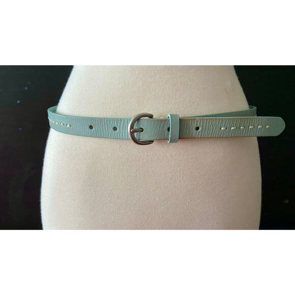 EDDIE BAUER Skinny Light Green Leather Belt w/Whipstitch Accent size S. Featuring a lightly distressed leather strap w/whipstitch accent and a solid brass silver buckle.