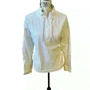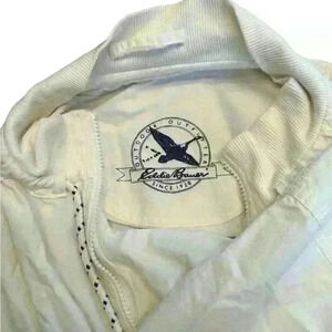 This elegant blouse from Eddie Bauer features a sophisticated bib collar with ruffled detailing, adding a touch of vintage charm. Crafted in a classic white hue, it boasts long sleeves and a buttoned front, making it a versatile addition to any wardrobe.