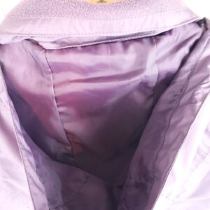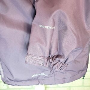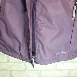 The jacket is a beautiful eggplant purple with full front double zipper with velcro which goes over the neck, a drawstring hood that can be rolled up out of sight, a drawstring waist, and a bottom drawstring, 2 front zipper pockets and 1 inside zipper pocket. Matching Eddie Bauer scarf included. Excellent condition, no signs of wear.