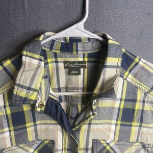 This Eddie Bauer women's shirt is perfect for any casual occasion. The plaid flannel fabric is soft and comfortable, making it a great choice for winter, summer, fall, or spring. The classic/fitted long sleeves and collared neckline add a touch of style, while the button-up closure and pockets provide both functionality and convenience.