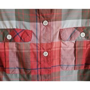 EDDIE BAUER Women's Size S Blouse - Button Up, Plaid, Coral Green, White, Front Pockets, Long Roll Tab Sleeve, Quick Dry, 100% Nylon