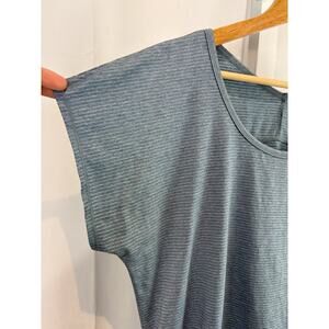 Scoop neck, v-back, dolman short sleeves, pullover style, gently shaped with ruched sides. Lightweight performance fabric in a subtle stripe. Blue-gray.