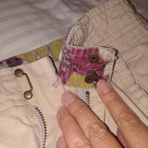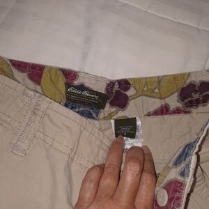 Eddie Bauer 100% cotton tan Pants size 4. Lost of pockets and wide belt loop. 9 inch rise 32 inch In seam. There is a super small light stain on the left knee but it is hardly noticeable. Super cool fastener at the waist and lots of great details in these pants. I have another pair of the same style in a difgerent color. Also I have quite a few Eddie Bauer pieces in my closet ( in this size) so if you love Eddie Bauer bundle and save a bunch!!