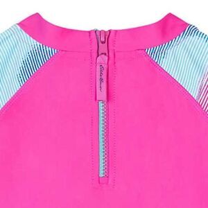 * Color block pink rash guard top with blue and pink watercolor print sleeves