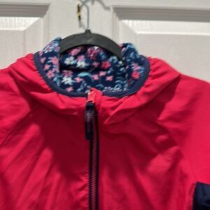 This gently used nylon and fleece item measures 17 inches from the bust to the length of 20 inches and has sleeves measuring 19 inches from shoulder to cuffs. It is suitable for children aged 6 or 7.