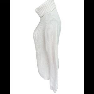 Eddie Bauer off white cable knit front turtleneck sweater, angora blend, size S. Cotton, nylon, wool, and angora rabbit blend. Ribbed turtleneck, cuffs and bottom hem. Approximate measurements are pit to pit flat 18”, length from shoulder approximately 25”.