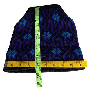 Vintage made in Hong Kong. 70% acrylic 30% wool. One size fits most. Lots of stretch. Black background with purple geometric and turquoise. Preowned with no apparent flaws.
