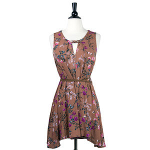 Sleeveless flowy top in sienna with rounded neckline featuring a keyhole cut-out and snap closure, single pleat detailing on either side and a soft floral print throughout. Wear it loose and flowy with skinny jeans or shorts or add a skinny belt to transform the look. Unlined.