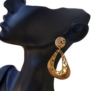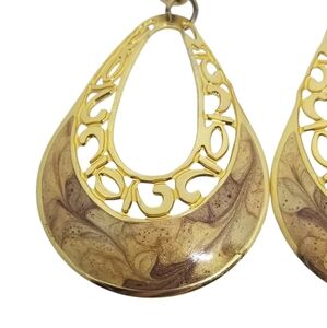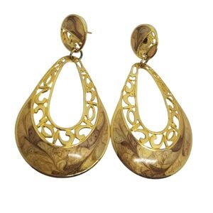 Beautiful vintage earrings by Edgar Berebi. Earrings are goldtone with a shimmery gold, tan, brown swirl enamel detail. Earrings are drop style with stud backs, measuring 2-1/2 inches tall and 1-3/8 inches wide. Lightweight and great condition.