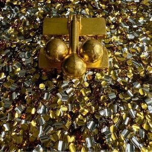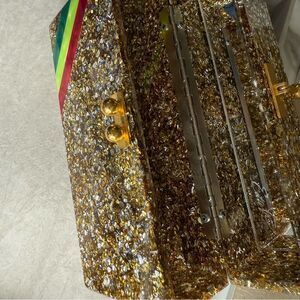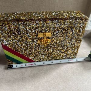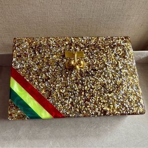This handcrafted bag features radiant gold and silver confetti lucite with bold red, yellow, and green stripes. A show-stopping, head-turning piece for any occasion.