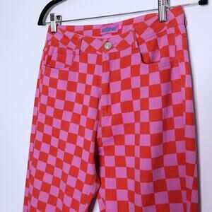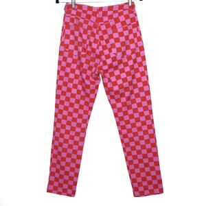 EDIKTED Rory Checkerboard Denim Jean Red Pink High Rise Straight Cut Women's S