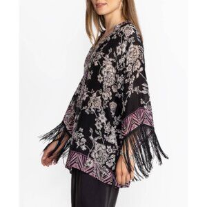 Lightweight flowing fabric. Henley neckline, wide sleeves with delicate fringe Black with dark pink/lavender --100% Rayon. Never worn. New with tags. Pet and smoke free home.