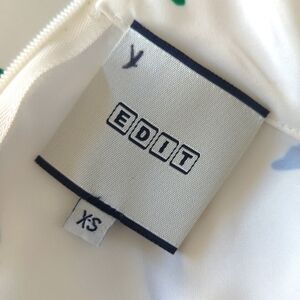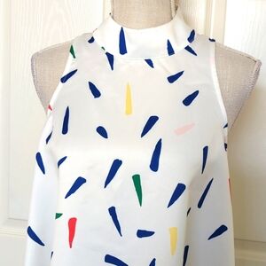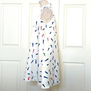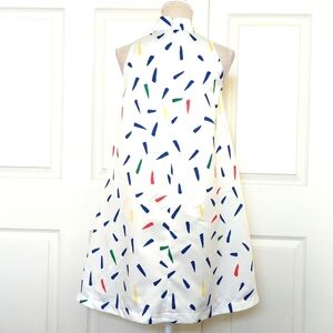 White High Neck Bright Spatter Dress by EDIT. Simple white dress with primary color splatter marks. Zipper back. Unlined. 100% Polyester. A-Line. Mod simple design