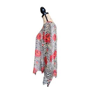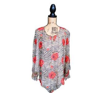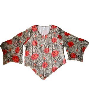 EDWARD sheer blouse in a womens large. This light and airy piece is a sheer zebra/rose print with a lined bodice and 3/4 length sheer flowy bell sleeves. The zebra print is a cream and taupe/brown with orange/red roses and olive colored leaves. The neck has a small slit with a front button clasp.