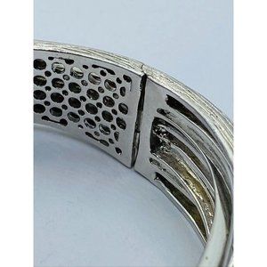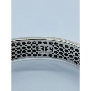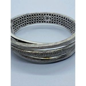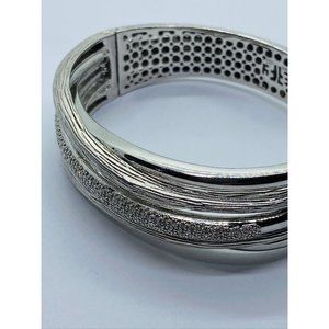 Gorgeous Effy sterling silver hinged bangle with tiny diamonds across the layered center of the top. There is an asymmetrical wrap design with 2 high polished rows and 2 textured rows that twist and frame the center diamond row, and they are 3D for a multi-bangle look. The other side of the bangle has the same 5 rows pushed together in a stack, and without the diamonds.