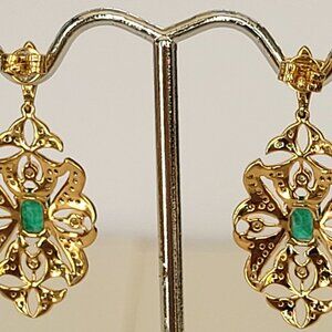 You are viewing an exquisite pair of EFFY Brasilica 14K Yellow Gold Emerald Diamond Floral Drop Earrings. Expertly crafted in 14K yellow gold, each earring showcases a vibrant emerald-cut emerald at its center, surrounded by an elegant floral motif adorned with sparkling white diamonds.