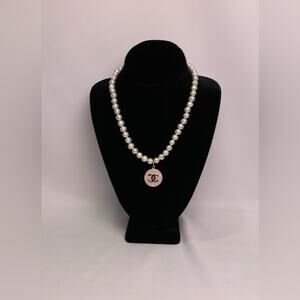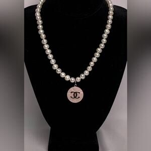 This elegant pearl necklace features a stunning silver Chanel pendant charm, perfect for adding a touch of sophistication to any outfit.