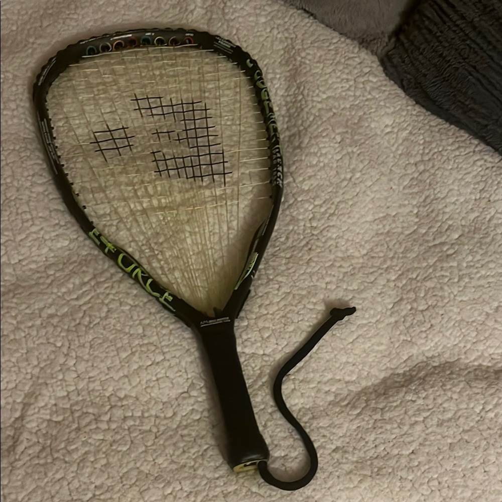 E-Force racquetball racket. Black frame with white strings. Comfortable grip.used excellent condition.