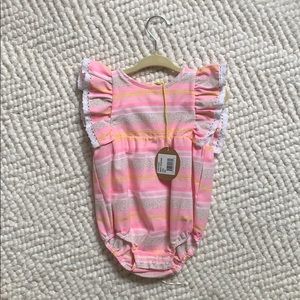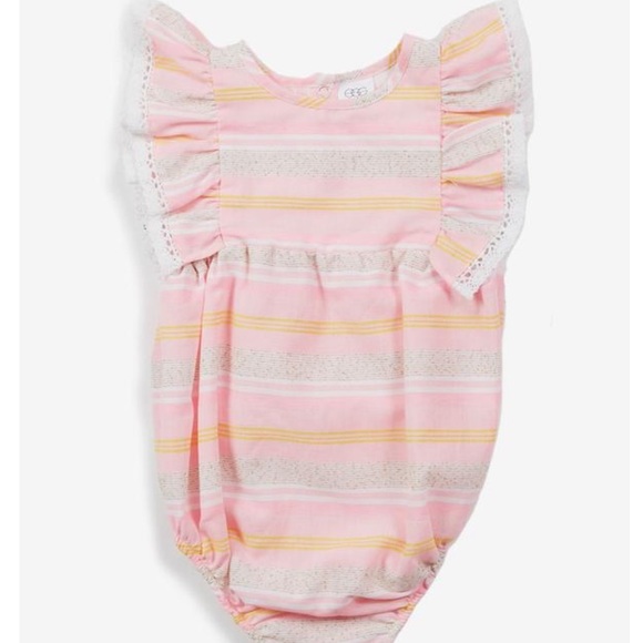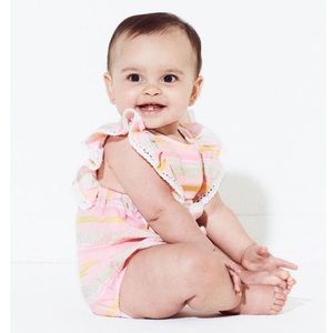 Brand new. SF/PF home.The Remy Baby Girls Romper by EGG Baby features horizontal stripes, ruffles along the shoulders with lace detailing and snaps on the back for easy wear. Body: 60% Polyester/40% Cotton, Lining: 100% Cotton, machine wash.