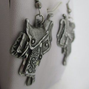 Never Worn Vintage Hallmarked EGO C '92 pewter South Western style Equestrian style saddle dangle drop French hook pierced earrings.