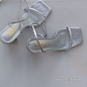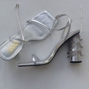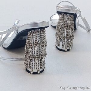 Elegant silver heel sandals with dazzling embellishments. Unique strappy design featuring a square toe and round rhinestone heel - from the Halston Heritage Collection.