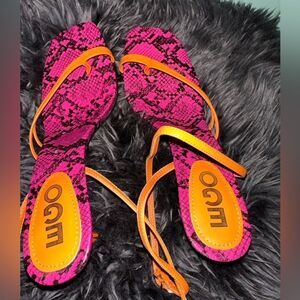EGO VEX PINK SNAKE PRINT INSOLE STRAPPY SQUARE TOE IN ORANGE FAUX LEATHER NWOT 9