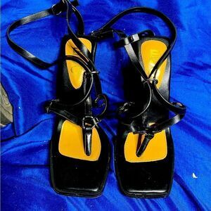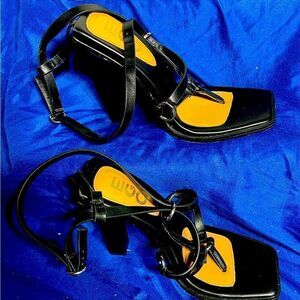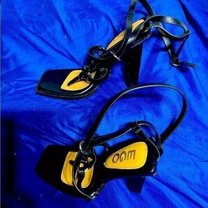 These 3 inch heels are a mix between a sandal and an evening wear shoe. The have an open concept and elegant leather- they tie up around the ankle ballerina style. Pair with jeans or a dress and add a dramatic yes classy flair.