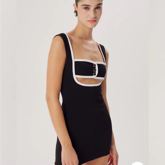 This mini dress is made from stretchy crepe to look like a two-piece style as it features a built-in bandeau. It’s designed for a close fit and has a generous cut out at front.