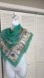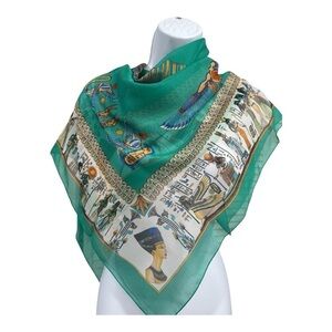 Vibrant green scarf with Egyptian motifs. Features intricate designs and a pharaoh illustration. EGYPT Souvenir Silky Scarf Gorgeous Vintage Turquoise & Yellow Tutankhamun 34” Square