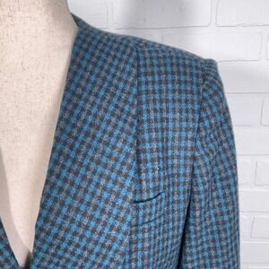 E.H. Woods Blazer Women 14 Turquoise Blue Black Double Breasted Check Wool Retro
