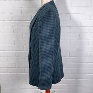 Keywords: E.H. Woods blazer, wool blazer, double breasted blazer, checkered blazer, blue blazer, gray blazer, vintage blazer, womens blazer, size 14, wool blend, classic blazer, professional blazer, career wear, retro blazer