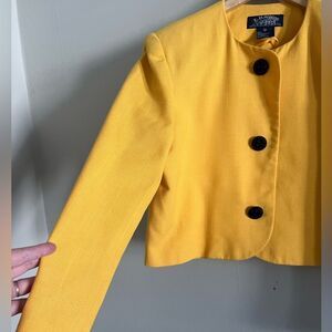vintage yellow blazer, cropped jacket, retro mod fashion, 80s style blazer, statement button jacket, minimalist bold outerwear, sunflower yellow jacket, vintage E.H. Woods, power blazer, spring layering, cottagecore meets mod