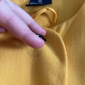 Bring a pop of retro color to your wardrobe with this structured E.H. Woods yellow cropped blazer, featuring bold black rosette-style buttons and clean, minimal lines. This vintage-inspired piece offers a unique silhouette that’s equal parts mod and modern.