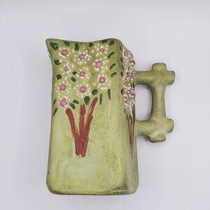 This vintage EHL 1960 Art Pottery Vase features a charming green floral design with a handle, perfect for adding a touch of elegance to any space. Ideal for displaying flowers or as a decorative piece.
