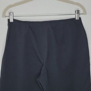 Black trousers made by Eileen Fisher in Petite (either medium or large). Size tag has been removed so please see measurements below! Hidden side zipper with hook and eye closure. Elastic waistband has some stretch. Has signs of normal wash and wear (black has lost its vibrance) but overall in GUC with no holes, snags, or stains. Bundle with other items from my closet for the best deal on shipping!