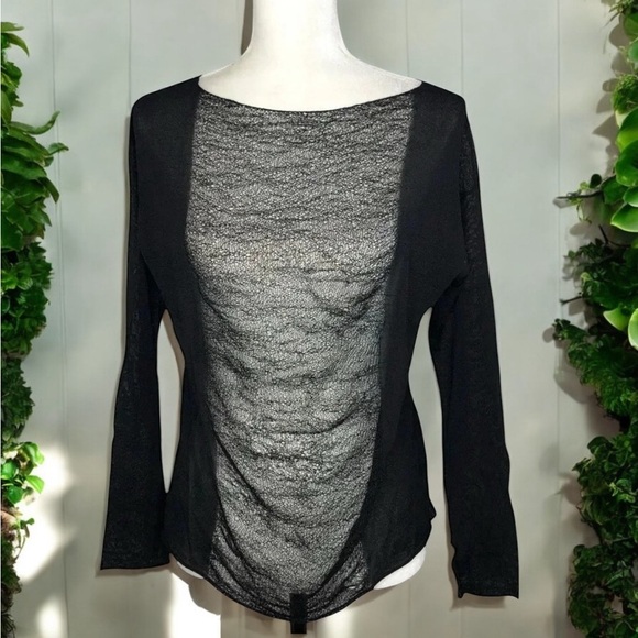 EILEEN FISHER Black Jewel Neck Semi Sheer Mesh Long Sleeve Scoop neck Top
