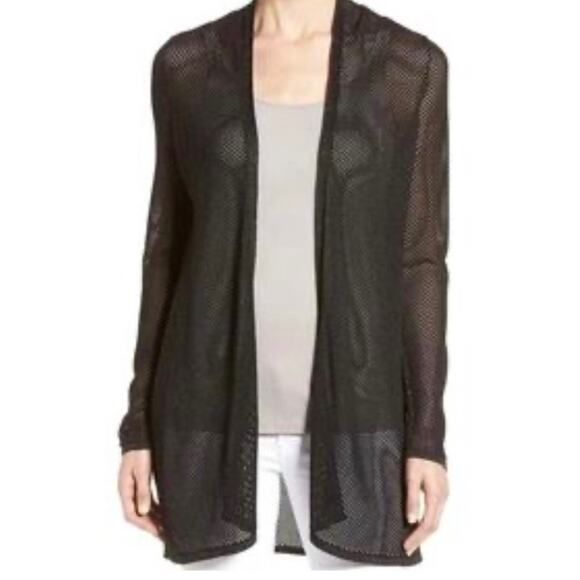 An Eileen Fisher open front cardigan sweater crafted from a black mesh knit. This long sleeve layering piece offers a relaxed silhouette. The textured knit provides subtle visual interest and breathability.