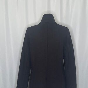 Short stand or mock collar at neckline … button tab details on the front of the collar ~ Long sleeves with three buttons on each end ~ Three button closures on the middle of the front ~ Two patch pockets on the lower front with buttoned flaps ~ Straight hemline with a vent on the back/bottom hem … front edges are curved ~ Jacket has raw edges all around ~ Longer thigh length ~ Soft unlined Merino Wool blend with a felted texture … fabric does have some stretch ~ Solid rich dark brown color