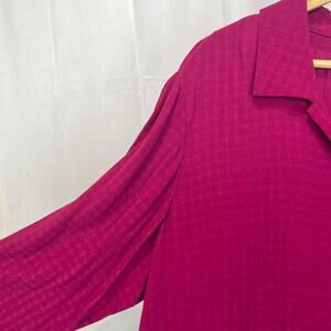 Collared, button front, 3/4 sleeves, relaxed fit, generous length. Sleek, drapey woven rayon with a grid / check texture in magenta purple-pink. Made in the USA.