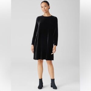 EILEEN FISHER CREW NECK VELVET DRESS KNEE-LENGTH SILK BLACK XXS $348 NEW