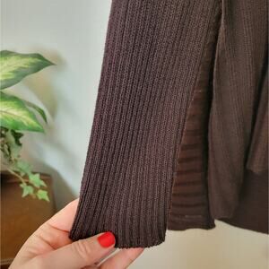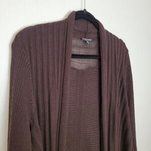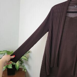 -Cardigan sweater by Eileen Fisher in a deep chocolate brown with ribbed detailing and a draped open front waterfall front style