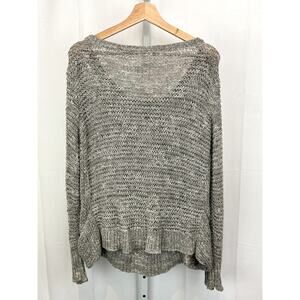 EILEEN FISHER L Open Knit Pullover Sweater Scoop Neck Pockets Cotton Nylon Gray