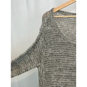 Scoop neck, long sleeves, pullover style, slouchy front pockets. Textured open knit in gray. Cotton / nylon.