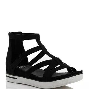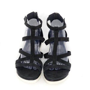 EILEEN FISHER NWOB Sola Tumbled Nubuck Leather Sandals Back Zipper Closure Black Adjustable Hook & Loop Straps Wedge Heel Strappy Comfort Shoes 1" Platform
